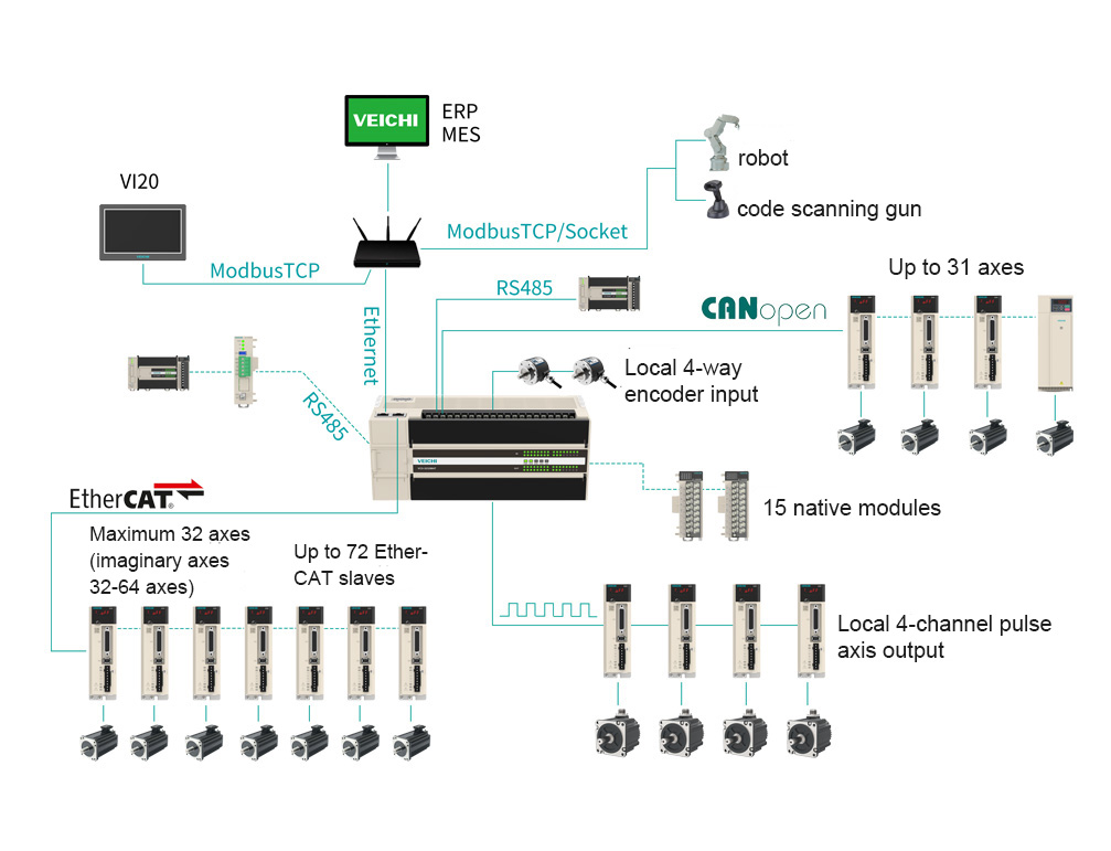 VC5 supports EtherCAT, Ethernet (Modbus-TCP, TCP/IP), CANopen, RS485 (Modbus, free protocol), RS232, Type-C. Support the N:N protocol independently developed by VEICHI. Multi-level network communication can be realized. In the occasions where there is information interaction with servo, vision, robot, code scanning gun, MES, etc., it brings all-around efficiency improvement for manufacturing.